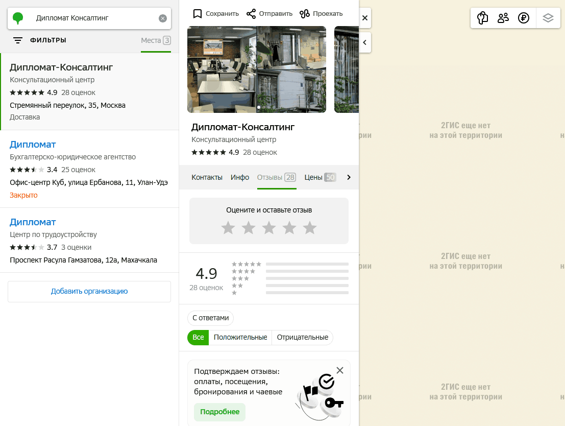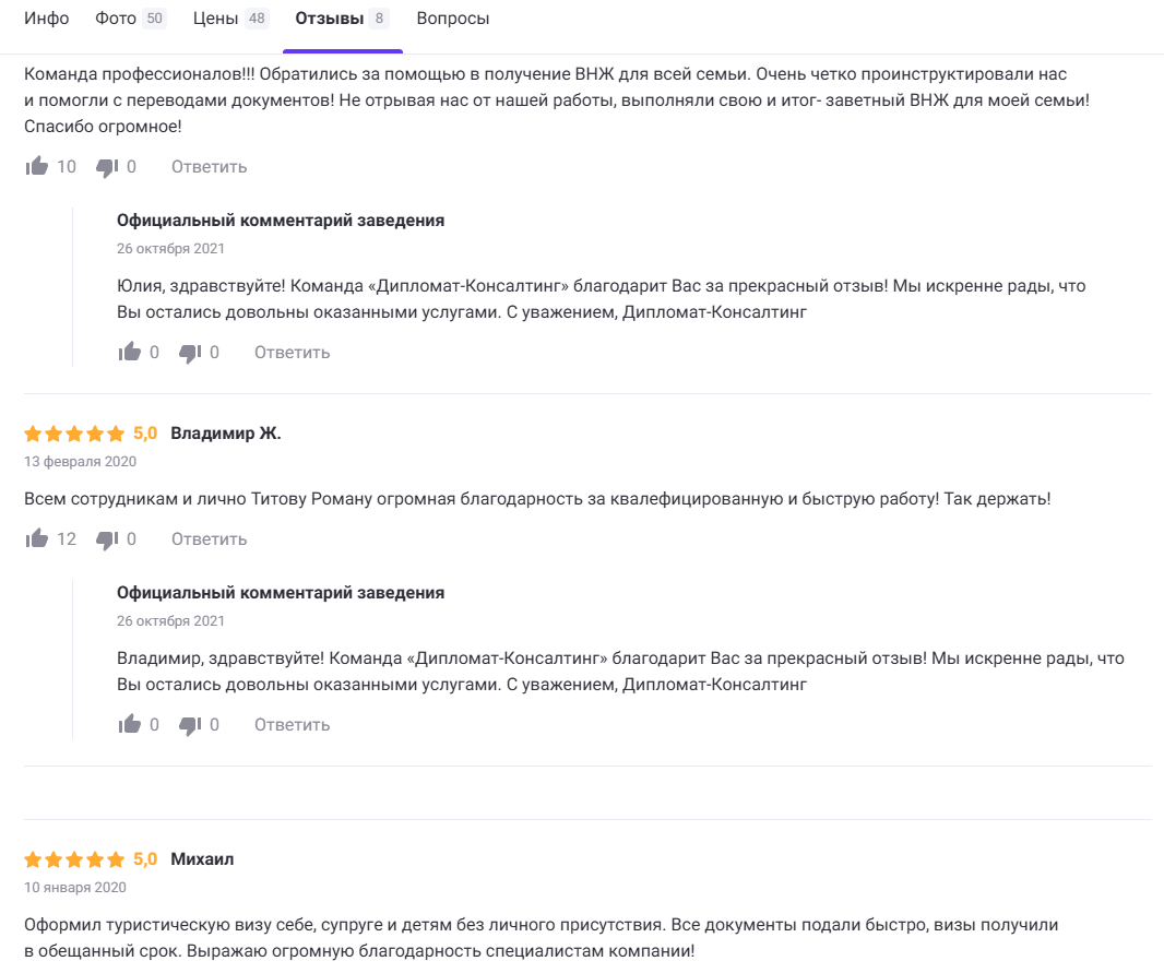 Отзывы о «Дипломат-Консалтинг» можно найти на глобальных платформах таких как Google maps, Яндекс.Карты, 2GIS, также они есть на Zoon.ру и форумах, посвященных иммиграции в Испанию. Для проверки рекомендуется смотреть на даты публикаций, подтвержденные профили авторов и сравнивать информацию с официальными источниками, избегая анонимных или устаревших комментариев.
