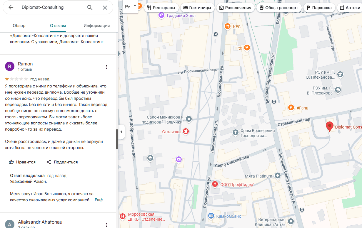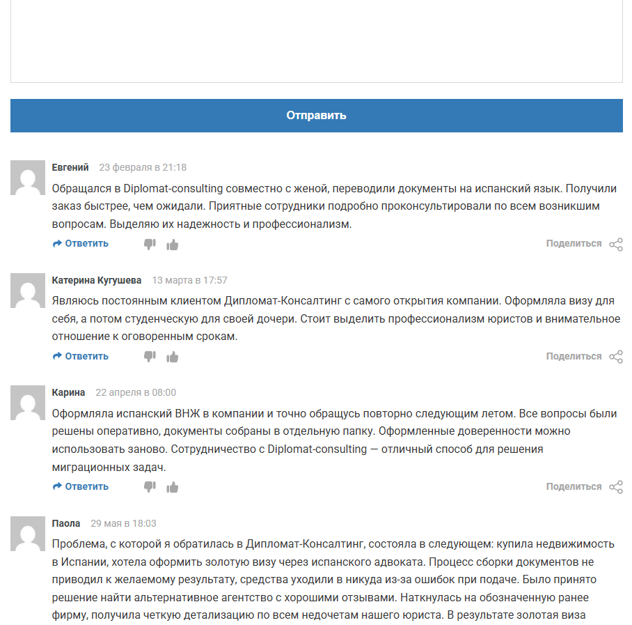 Отзывы о «Дипломат-Консалтинг» часто касаются офиса в Москве на Стремянном переулке, в комментариях клиенты делятся своим персональным опытом сотрудничества с компанией по вопросам оформления виз и ВНЖ Испании, отмечают профессионализм сотрудников, подчеркивают удобство дистанционного взаимодействия и решения сложных кейсов.