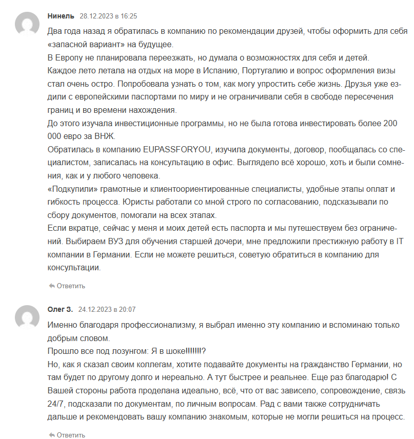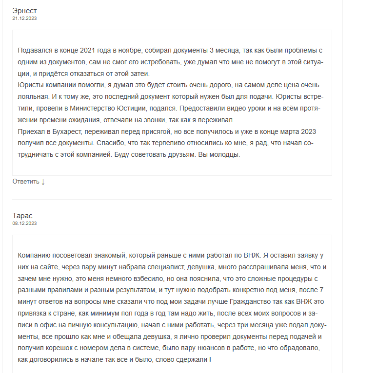 В целом большинство комментов носят положительный характер: на платформах размещают развернутые отзывы и рассказывают об опыте оформления гражданства Румынии и Кыргызстана, отмечая сильные стороны сотрудничества с компанией.