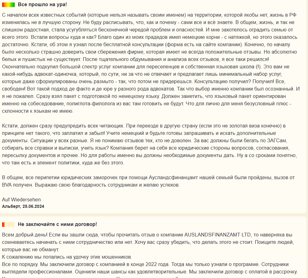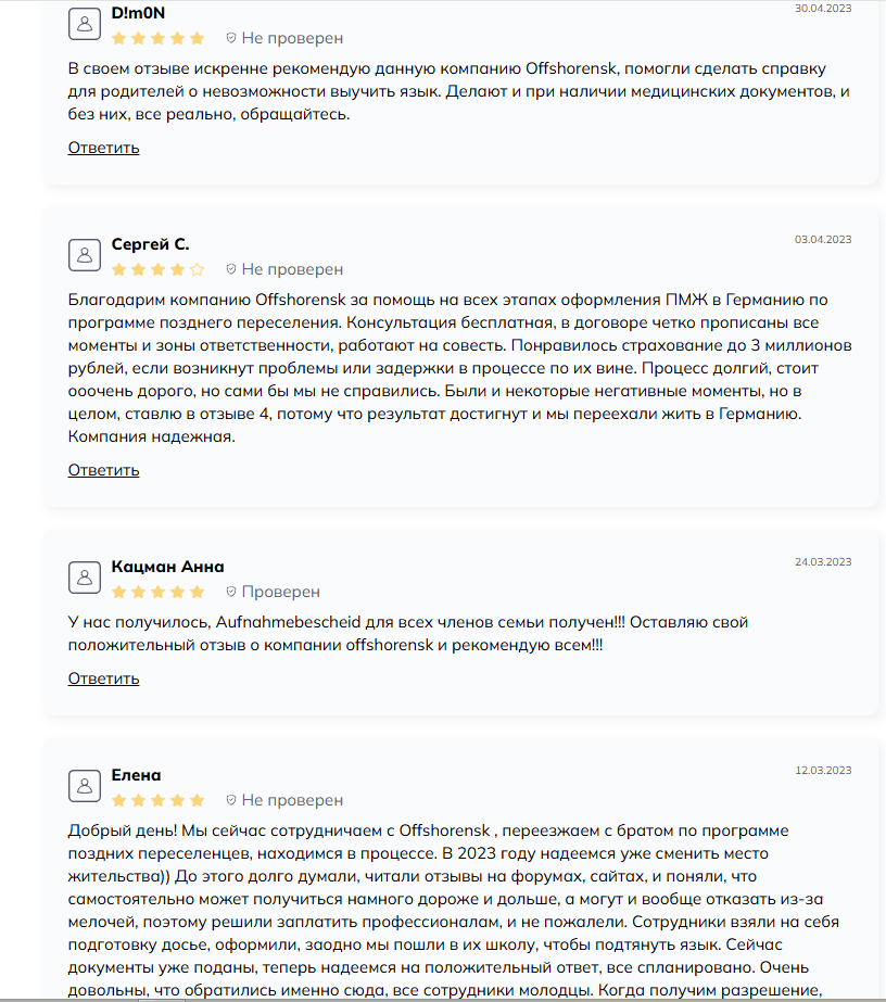 Отзывы про Offshorensk встречаются на платформах vashe-mnenie и migranty.про, где клиенты делятся опытом регистрации компаний в офшорах и помощи в релокации в Германию. Большинство отзывов об Offshorensk положительные, хотя встречаются и негативные с отдельными жалобами на некомпетентность персонала, не удобную коммуникацию по имейлу с задержками в ответах и затягиванием сроков.