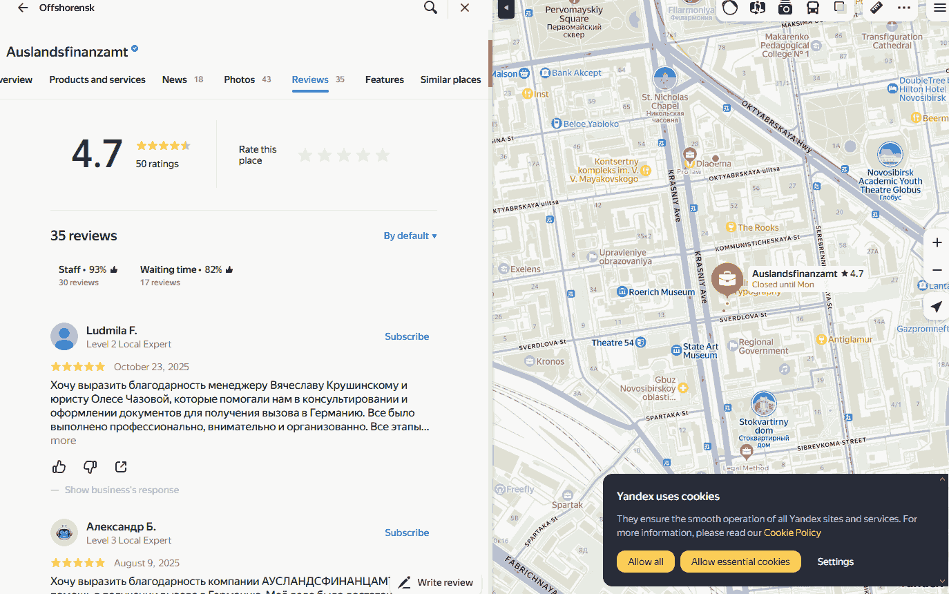 На Google Maps у компании Offshorensk нет отзывов и рейтинга. В то же время, на Yandex maps ее рейтинг на момент написания обзора — 4,7, отзывы на Яндексе об Оффшоренск в основном положительные, пользователи отмечают профессионализм команды в Германии и описывают свой опыт получения ВНЖ в этой стране.
