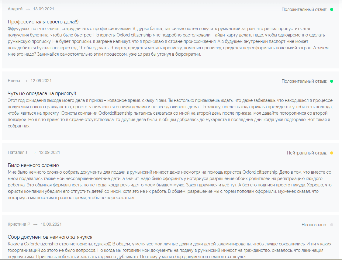 В части отзывов отмечены нейтральные мнения, где клиенты описывают стандартные процедуры оформления гражданства, особенности принятия присяги для получения румынского паспорта или процесс получения ВНЖ на территории Евросоюза.