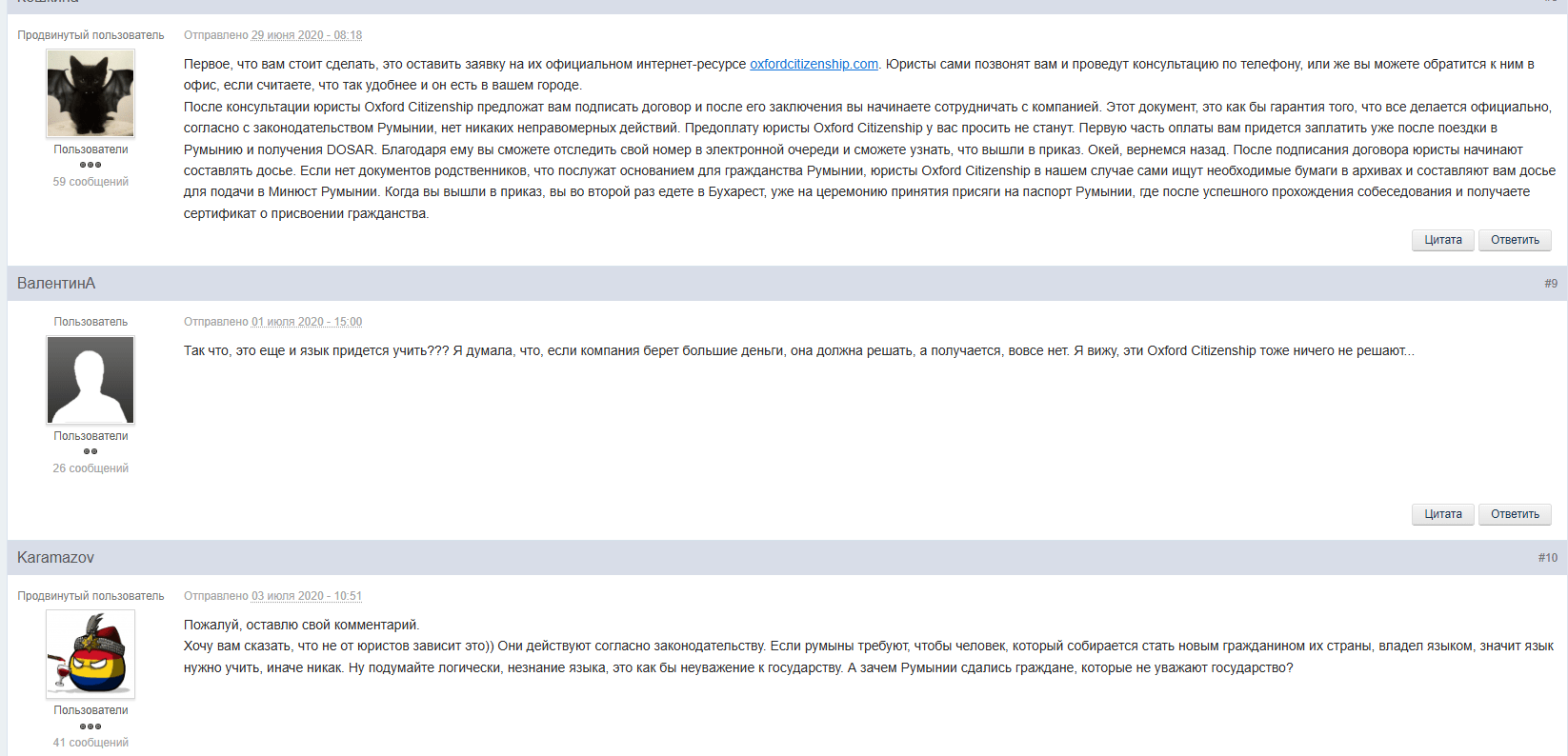 На тематическом форуме об иммиграции в ЕС в отзывах об Oxford Citizenship обсуждают опыт сотрудничества с компанией, отмечают профессиональный подход и знание своего дела юристами в вопросах репатриации. Тут преобладают положительные, по большей части хвалебные, отзывы клиентов об Oxford citizenship.