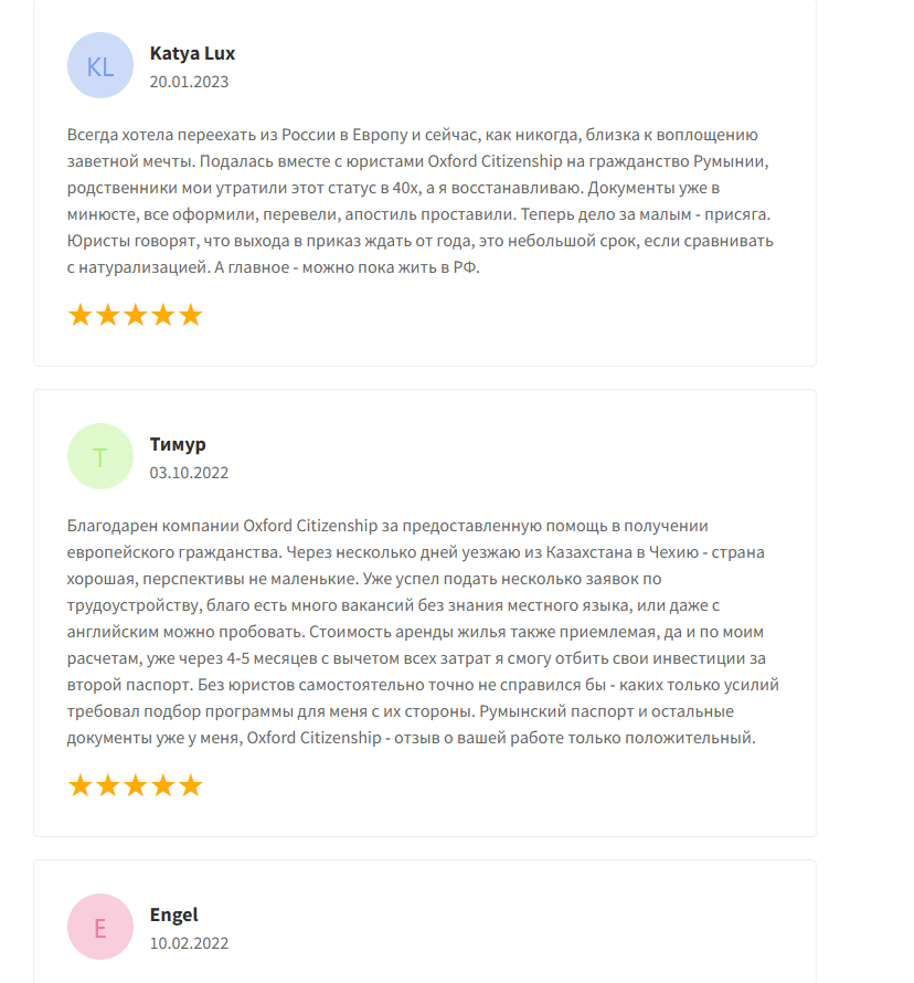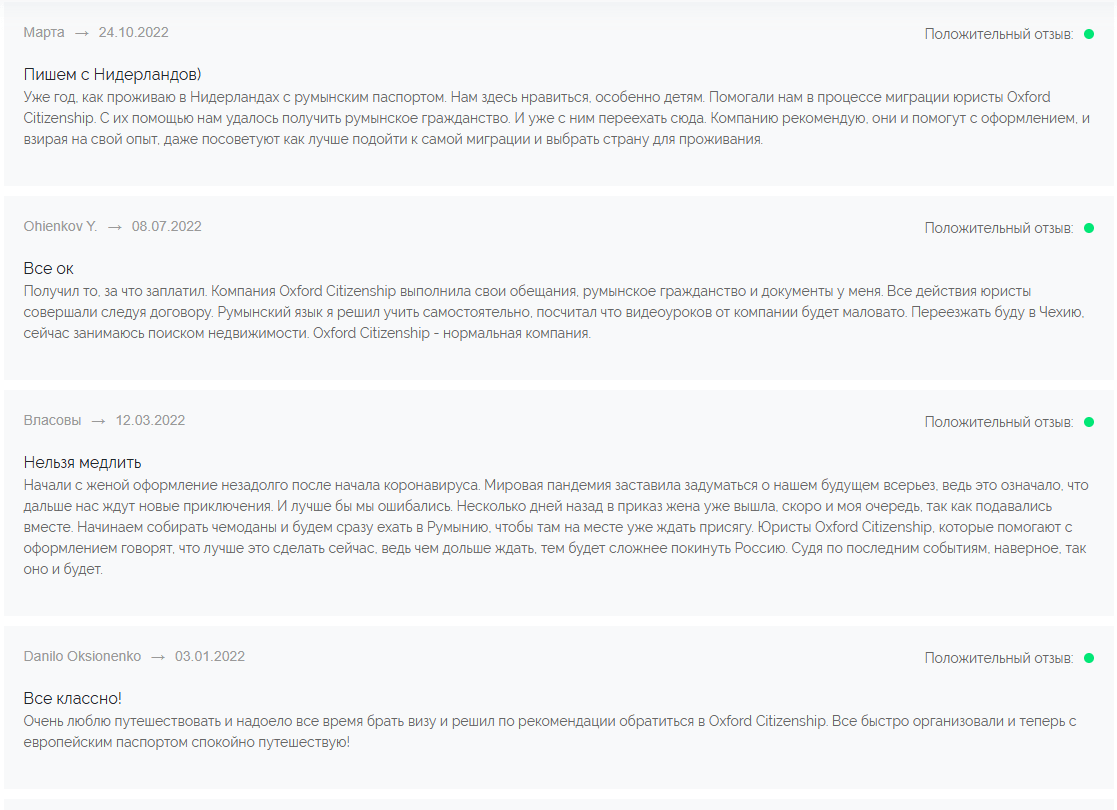 Отзывы о компании Oxford Citizenship в интернете можно найти на таких ресурсах как отзовики, форумы, профильные сайты для иммигрантов. В отзывах об Oxford citizenship пользователи отмечают профессионализм юристов, описывают свой персональный опыт сотрудничества и отдельные кейсы репатриации в Румынию и Болгарию. Общий тон мнений о компании — положительный, с акцентом на поэтапный комплексный подход к решению клиентских запросов.
